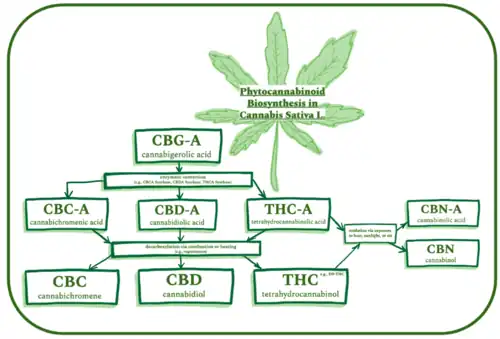 CBN is unique among phytocannabinoids in that its biosynthetic pathway involves conversion directly from Δ9-THC, rather than from an acidic precursor form of CBN (e.g., Δ9-THC arises through decarboxylation of THC-A). CBN can be found in trace amounts in the Cannabis plant, found mostly in cannabis that is aged and stored, allowing for CBN formation through the oxidation of the cannabis plant's main psychoactive and intoxicating chemical, tetrahydrocannabinol (THC). This process of oxidation occurs via exposure to heat, oxygen, and/or light. Although reports are limited, CBN-A has also been measured at very low levels in the cannabis plant, thought to have formed via hydrolyzation of THC-A (see Phytocannabinoid Biosynthesis diagram, below).