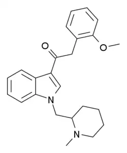 - ↑ Uchiyama N, Kikura-Hanajiri R, Goda Y (2011). "Identification of a novel cannabimimetic phenylacetylindole, cannabipiperidiethanone, as a designer drug in a herbal product and its affinity for cannabinoid CB₁ and CB₂ receptors". Chemical & Pharmaceutical Bulletin. 59 (9): 1203–5. doi:10.1248/cpb.59.1203. PMID 21881274.