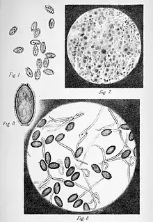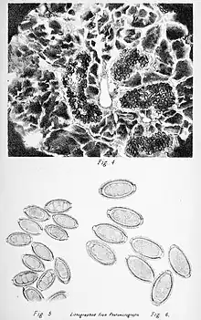 | One of the plates published with the original description of the species, showing the masses of eggs in the liver of the host (above) and free alive eggs (below). | |