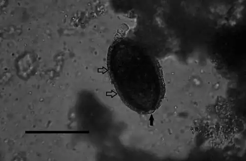 Adult worms take the shape of a slender nematode, with the anterior part of the body narrow and the posterior part gradually swelling.[5] The females measure about 53–78mm x 0.11–0.20mm, but the males are approximately 24–37mm x 0.07–0.10mm.[5] The adult worms are rarely seen intact, as they mature and die in the parenchyma of the liver.[6] The adult females lay eggs that are about 48-66μm x 28-36μm.[5] The shell of the eggs is striated with shallow polar prominences at either end. Numerous mini-pores can be seen in the outer shell as well. Unembryonated eggs may be ingested by a carnivore, in which case they are harmless and pass out in the feces. Eggs will embryonate in the environment, where they require air and damp soil to become infective. Under optimal conditions this takes about 30 days. Larvae are juvenile versions of the adult worm.[1]