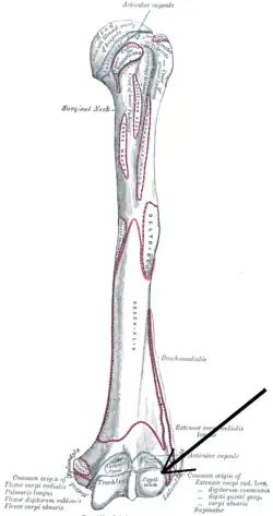Left humerus seen from front (capitulum visible at bottom right) | |