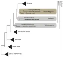 C. owczarzaki is together with Ministeria vibrans a member of the Filasterea clade.[10][1] This group is the sister group to a clade comprising Metazoa and Choanoflagellata, which together form the Filozoa.[10][1][11] C. owczarzaki was originally described as nucleariids.[7] However, later molecular ribosomal phylogenies placed C. owczarzaki somewhere closer to animals than the rest of nucleariids.[12][13][14] Finally, a multi-gene phylogenetic analysis with several opisthokont taxa clearly showed that C. owczarzaki is not a nucleariid, but part of the Holozoa.[15][16] This was later on corroborated by phylogenomic analyses,[17][18] one of which [18] situated it as sister-group to Ministeria forming the Filasterea clade, which is the sister-group to Choanoflagellatea and Metazoa.[19][20]