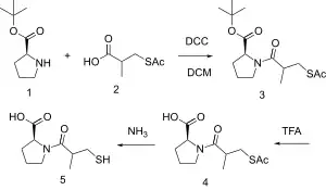 A chemical synthesis of captopril by treatment of L-proline with (2S)-3-acetylthio-2-methylpropanoyl chloride under basic conditions (NaOH), followed by aminolysis of the protective acetyl group to unmask the drug's free thiol, is depicted in the figure at right.[20]