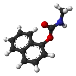 Carbaryl (1-naphthyl methylcarbamate) is a chemical in the carbamate family used chiefly as an insecticide. It is a white crystalline solid previously sold under the brand name Sevin, which was a trademark of the Bayer Company. The Sevin trademark has since been acquired by GardenTech, which has eliminated carbaryl from most Sevin formulations.[3][4] Union Carbide discovered carbaryl and introduced it commercially in 1958. Bayer purchased Aventis CropScience in 2002, a company that included Union Carbide pesticide operations. Carbaryl was the third-most-used insecticide in the United States for home gardens, commercial agriculture, and forestry and rangeland protection. As a veterinary drug, it is known as carbaril (INN).