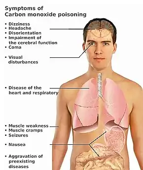 - ↑ Ernst A, Zibrak JD (November 1998). "Carbon monoxide poisoning". The New England Journal of Medicine. 339 (22): 1603–08. doi:10.1056/NEJM199811263392206. PMID 9828249. Archived from the original on 2021-08-28. Retrieved 2020-07-13.