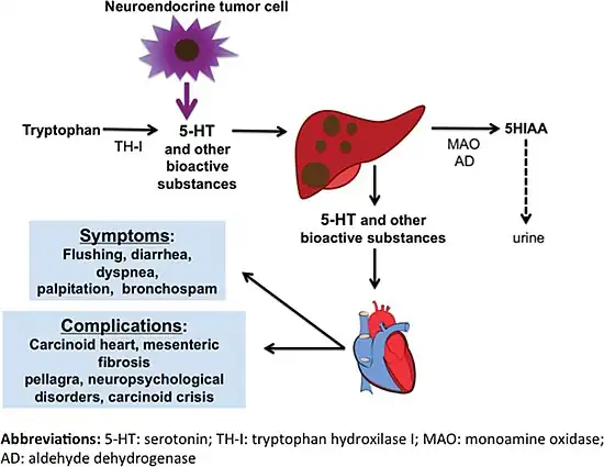 - ↑ 3.00 3.01 3.02 3.03 3.04 3.05 3.06 3.07 3.08 3.09 3.10 3.11 3.12 3.13 3.14 3.15 3.16 3.17 3.18 3.19 3.20 Pandit, S; Annamaraju, P; Bhusal, K (January 2020). "Carcinoid Syndrome". StatPearls. PMID 28846309.