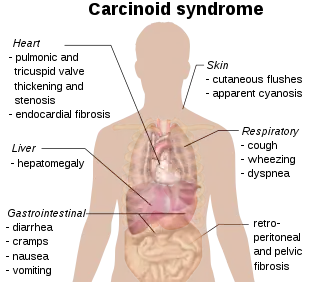 Carcinoid syndrome is a group of symptoms that occur as a result of substances released by neuroendocrine tumors (carcinoid tumors).[3] Symptoms may includes flushing, diarrhea, wheezing, itchiness, muscle wasting, and tiredness.[3] Complications may include low blood pressure, niacin deficiency, and valvular heart disease, most commonly tricuspid insufficiency.[3][4]
