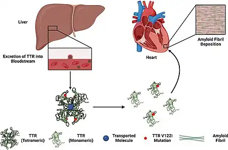 - ↑ 7.0 7.1 7.2 7.3 Ruberg FL, Berk JL (2012-09-04). "Transthyretin (TTR) Cardiac Amyloidosis". Circulation. 126 (10): 1286–1300. doi:10.1161/CIRCULATIONAHA.111.078915. ISSN 0009-7322. PMC 3501197. PMID 22949539.
