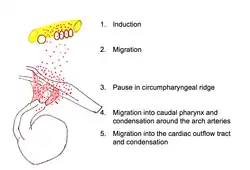 Pharyngeal arches are tissues composed of mesoderm-derived cells enclosed by an external ectoderm and an internal endoderm.[2] Once the caudal pharyngeal arches are formed, cardiac neural crest complexes will migrate towards these and colonise in arches 3, 4 and 6. Cells leading this migration maintain contact with the extracellular matrix and contain filopodia which act as extensions towards the ectodermal pharyngeal arches.[2][14] A range of secreted factors ensure appropriate directionality of the cells. FGF8 acts as a chemotactic attraction in directing cellular movement towards pharyngeal arch 4.[1][14]