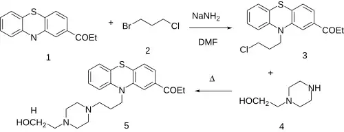 The alkylation reaction between 2-propionyl phenothiazine (1) and 1-bromo-3-chloropropane (2) gives 1-[10-(3-chloropropyl)phenothiazin-2-yl]propan-1-one (3). A second alkylation step, this time with 2-(1-Piperazinyl)ethanol (4), completes the synthesis of carfenazine (5).