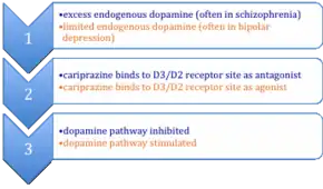 Unlike many antipsychotics that are D2 and 5-HT2A receptor antagonists, cariprazine is a D2 and D3 partial agonist. It also has a higher affinity for D3 receptors. The D2 and D3 receptors are important targets for the treatment of schizophrenia, because the overstimulation of dopamine receptors has been implicated as a possible cause of schizophrenia.[16] Cariprazine acts to inhibit overstimulated dopamine receptors (acting as an antagonist) and stimulate the same receptors when the endogenous dopamine levels are low. Cariprazine's high selectivity towards D3 receptors could prove to reduce side effects associated with the other antipsychotic drugs, because D3 receptors are mainly located in the ventral striatum and would not incur the same motor side effects (extrapyramidal symptoms) as drugs that act on dorsal striatum dopamine receptors.[17] Cariprazine also acts on 5-HT1A receptors, though the affinity is considerably lower than the affinity to dopamine receptors (seen in monkey and rat brain studies).[17][18] In the same studies, cariprazine has been noted to produce pro-cognitive effects, the mechanisms of which are currently under investigation. An example of pro-cognitive effects occurred in pre-clinical trials with rats: rats with cariprazine performed better in a scopolamine-induced learning impairment paradigm in a water labyrinth test. This may be due to the selective antagonist nature of D3 receptors, though further studies need to be conducted.[17] This result could be very useful for schizophrenia, as one of the symptoms includes cognitive deficits.