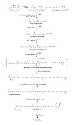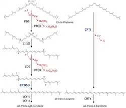 - ↑ Armstrong GA, Hearst JE (1996). "Carotenoids 2: Genetics and molecular biology of carotenoid pigment biosynthesis". FASEB J. 10 (2): 228–37. doi:10.1096/fasebj.10.2.8641556. PMID 8641556. S2CID 22385652.