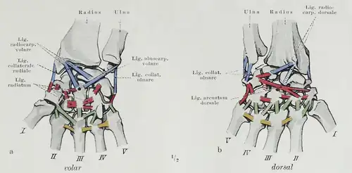 - The ligaments of the wrist proper which unite the ulna and radius with the carpus: the ulnar and radial collateral ligaments; the palmar and dorsal radiocarpal ligaments; and the palmar ulnocarpal ligament. (Shown in blue in the figure.)