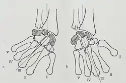 Because many tetrapods have fewer than five digits on the forelimb, even greater degrees of fusion are common, and a huge array of different possible combinations are found. The wing of a modern bird, for example, has only two remaining carpals; the radiale (the scaphoid of mammals) and a bone formed from the fusion of four of the distal carpals.[13]