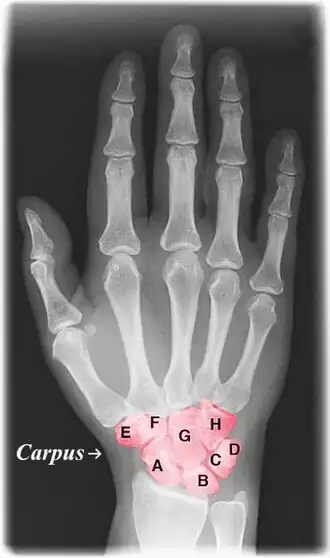 In tetrapods, the carpus is the sole cluster of bones in the wrist between the radius and ulna and the metacarpus. The bones of the carpus do not belong to individual fingers (or toes in quadrupeds), whereas those of the metacarpus do. The corresponding part of the foot is the tarsus. The carpal bones allow the wrist to move and rotate vertically.[1]