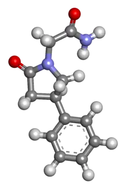 Side effects of phenylpiracetam include sleep disturbances among others.[2] The mechanism of action of phenylpiracetam was originally unknown.[2][4][5] However, it was discovered that (R)-phenylpiracetam is a selective atypical dopamine reuptake inhibitor in 2014.[4][6] In addition, phenylpiracetam interacts with certain nicotinic acetylcholine receptors.[5] Chemically, phenylpiracetam is a racetam and phenethylamine and is structurally related to piracetam.[2][7]