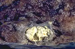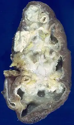 Caseous necrosis or caseous degeneration[1] (/ˈkeɪsiəs/)[2] is a unique form of cell death in which the tissue maintains a cheese-like appearance.[3] Unlike with coagulative necrosis, tissue structure is destroyed. Caseous necrosis is enclosed within a granuloma. Caseous necrosis is most notably associated with tuberculoma. The dead tissue appears as a soft and white proteinaceous dead cell mass.