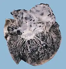 Some substances cause cancer primarily through their physical, rather than chemical, effects on cells.[31] A prominent example of this is prolonged exposure to asbestos, naturally occurring mineral fibers which are a major cause of mesothelioma, which is a cancer of the serous membrane, usually the serous membrane surrounding the lungs.[31] Other substances in this category, including both naturally occurring and synthetic asbestos-like fibers such as wollastonite, attapulgite, glass wool, and rock wool, are believed to have similar effects.[31] Non-fibrous particulate materials that cause cancer include powdered metallic cobalt and nickel, and crystalline silica (quartz, cristobalite, and tridymite).[31] Usually, physical carcinogens must get inside the body (such as through inhaling tiny pieces) and require years of exposure to develop cancer.[31] Common occupational carcinogens include:[32]