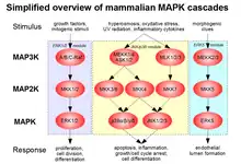 Genetic studies show that specific gene mutations or deletions are causes for the disease. The genes identified for cerebral cavernous hemangiomas (or malformations), are CCM1 (also KRIT1), CCM2 (also MGC4607, malcavernin) and CCM3 (also PDCD10). The loss of function of these genes is believed to be responsible for cerebral cavernous malformations.[16] Furthermore, it is also believed that a "second hit mutation" is necessary for the onset of the disease. This means that having a mutation in one of the two genes present on a chromosome is not enough to cause the cavernous malformation, but mutation of both alleles would cause the malformation. Additionally, research on hemangiomas in general has shown that loss of heterozygosity is common in tissue where hemangioma develops.[17] This would confirm that more than a single allele mutation is needed for the abnormal cell proliferation. KRIT1 has been shown to act as a transcription factor in the development of arterial blood vessels in mice. CCM2 has overlapping structure with CCM1 (KRIT1) and acts as a scaffolding protein when expressed. Both genes are involved with MAP3K3 and thus appear to be a part of the same pathway.