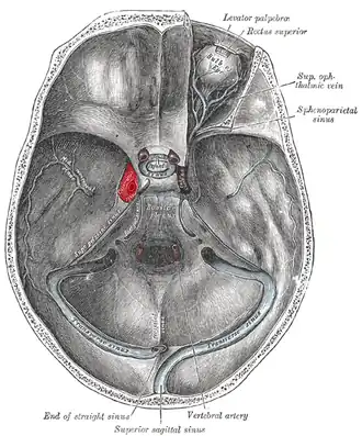 ![]() The sinuses at the base of the skull. Cavernous sinus labeled in red | |