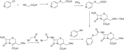 In one of the syntheses, 7-aminocephalosporanic acid (7-ACA) is reacted with bromoacetyl chloride to give the amide. The halo group is then displaced by 4-thiopyridine.[3]