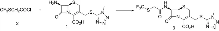 - ↑ DeMarinis RM, Boehm JC, Dunn GL, Hoover JR, Uri JV, Guarini JR, et al. (January 1977). "Semisynthetic cephalosporins. Synthesis and structure-activity relationships of analogues with 7-acyl groups derived from 2-(cyanomethylthio)acetic acid or 2-[(2,2,2-trifluoroethyl)thio]acetic acid and their sulfoxides and sulfones". Journal of Medicinal Chemistry. 20 (1): 30–5. doi:10.1021/jm00211a006. PMID 319233.