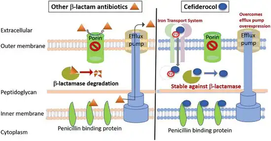 - ↑ Ito A, Nishikawa T, Matsumoto S, et al. (December 2016). "Siderophore Cephalosporin Cefiderocol Utilizes Ferric Iron Transporter Systems for Antibacterial Activity against Pseudomonas aeruginosa". Antimicrobial Agents and Chemotherapy. 60 (12): 7396–7401. doi:10.1128/AAC.01405-16. PMC 5119021. PMID 27736756.
