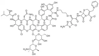 Cefilavancin (TD-1792) is an experimental antibiotic medication developed for the treatment of bacterial infections such as drug-resistant strains of Staphylococcus aureus. It is a prodrug which is also a codrug, injected intravenously and then cleaved inside the body to two active components, one of which is a modified form of vancomycin and the other a cephalosporin antibiotic. In clinical trials cefilavancin has shown similar efficacy with reduced side effects compared to vancomycin itself.[1][2][3][4][5][6][7][8]