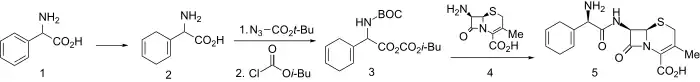 Birch reduction of D-α-phenylglycine led to diene (2). This was N-protected using tert-butoxycarbonylazide and activated for amide formation via the mixed anhydride method using isobutylchloroformate to give 3. Mixed anhydride 3 reacted readily with 7-aminodesacetoxycephalosporanic acid to give, after deblocking, cephradine (5).
