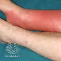 | Differential diagnosis | Deep vein thrombosis, stasis dermatitis, erysipelas, Lyme disease, necrotizing fasciitis[1][4][5] |