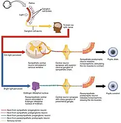 The brainstem at large provides entry and exit to the brain for a number of pathways for motor and autonomic control of the face and neck through cranial nerves,[9] Autonomic control of the organs is mediated by the tenth cranial nerve.[6] A large portion of the brainstem is involved in such autonomic control of the body. Such functions may engage the heart, blood vessels, and pupils, among others.[9]