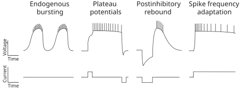 CPG neurons can have different intrinsic membrane properties (see schematic).[12] Some neurons fire bursts of action potentials, either endogenously or in the presence of neuromodulatory substances. Other neurons are bistable and generate plateau potentials that can be triggered by a depolarizing current pulse, and terminated by a hyperpolarizing current pulse. Many CPG neurons fire after being released from inhibition (postinhibitory rebound). Another common feature of CPG neurons is a decrease in the frequency of firing during a constant depolarization (spike frequency adaptation).
