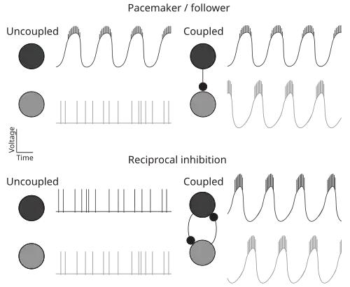 Rhythm generation in CPG networks depends on the intrinsic properties of CPG neurons and their synaptic connections. There are two general mechanisms for rhythm generation: pacemaker/follower and reciprocal inhibition (see schematic).[12]
