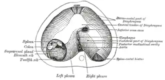 ![]() The thoracic aspect of the diaphragm of a newly born child in which the communication between the peritoneum and pleura has not been closed on the left side; the position of the opening is marked on the right side by the spinocostal hiatus. | |