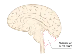 Cerebellar agenesis is a rare condition in which a brain develops without the cerebellum. The cerebellum controls smooth movement, and when it does not develop, the rest of the brain must compensate, which it cannot do completely.[1] The condition is not fatal on its own, but people born without a cerebellum experience severe developmental delays, language deficits, and neurological abnormalities.[2] As children with cerebellar agenesis get older, their movements usually improve.[3] It can co-exist with other severe malformations of the central nervous system, like anencephaly, holoprosencephaly, and microencephaly.[1]