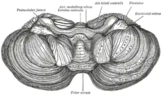 ![]() Anterior view of the cerebellum. (Tonsil visible at center right.) | |