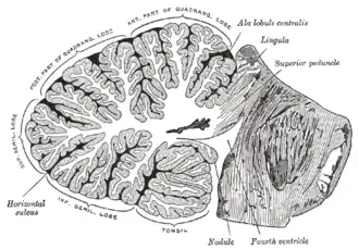 ![]() Sagittal section of the cerebellum, near the junction of the vermis with the hemisphere. (Tonsil visible at bottom center.) | |