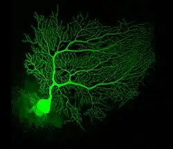 Purkinje cells are among the most distinctive neurons in the brain, and one of the earliest types to be recognized—they were first described by the Czech anatomist Jan Evangelista Purkyně in 1837. They are distinguished by the shape of their dendritic tree: the dendrites branch very profusely, but are severely flattened in a plane perpendicular to the cerebellar folds. Thus, the dendrites of a Purkinje cell form a dense planar net, through which parallel fibers pass at right angles.[11] The dendrites are covered with dendritic spines, each of which receives synaptic input from a parallel fiber. Purkinje cells receive more synaptic inputs than any other type of cell in the brain—estimates of the number of spines on a single human Purkinje cell run as high as 200,000.[11] The large, spherical cell bodies of Purkinje cells are packed into a narrow layer (one cell thick) of the cerebellar cortex, called the Purkinje layer. After emitting collaterals that affect nearby parts of the cortex, their axons travel into the deep cerebellar nuclei, where they make on the order of 1,000 contacts each with several types of nuclear cells, all within a small domain. Purkinje cells use GABA as their neurotransmitter, and therefore exert inhibitory effects on their targets.[11]