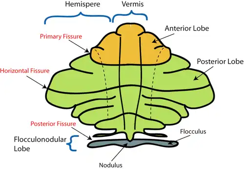 Based on the surface appearance, three lobes can be distinguished within the cerebellum: the anterior lobe (above the primary fissure), the posterior lobe (below the primary fissure), and the flocculonodular lobe (below the posterior fissure). These lobes divide the cerebellum from rostral to caudal (in humans, top to bottom). In terms of function, however, there is a more important distinction along the medial-to-lateral dimension. Leaving out the flocculonodular lobe, which has distinct connections and functions, the cerebellum can be parsed functionally into a medial sector called the spinocerebellum and a larger lateral sector called the cerebrocerebellum.[14] A narrow strip of protruding tissue along the midline is called the cerebellar vermis. (Vermis is Latin for "worm".)[14]