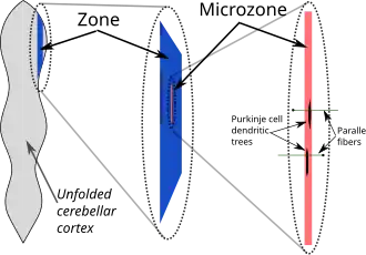 Oscarsson in the late 1970s proposed that these cortical zones can be partitioned into smaller units called microzones.[30] A microzone is defined as a group of Purkinje cells all having the same somatotopic receptive field. Microzones were found to contain on the order of 1000 Purkinje cells each, arranged in a long, narrow strip, oriented perpendicular to the cortical folds.[28] Thus, as the adjoining diagram illustrates, Purkinje cell dendrites are flattened in the same direction as the microzones extend, while parallel fibers cross them at right angles.[11]