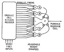 Theories in the "learning" category almost all derive from publications by Marr and Albus. Marr's 1969 paper proposed that the cerebellum is a device for learning to associate elemental movements encoded by climbing fibers with mossy fiber inputs that encode the sensory context.[27] Albus proposed in 1971 that a cerebellar Purkinje cell functions as a perceptron, a neurally inspired abstract learning device.[7] The most basic difference between the Marr and Albus theories is that Marr assumed that climbing fiber activity would cause parallel fiber synapses to be strengthened, whereas Albus proposed that they would be weakened. Albus also formulated his version as a software algorithm he called a CMAC (Cerebellar Model Articulation Controller), which has been tested in a number of applications.[55]