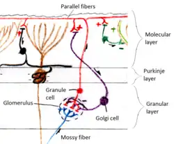 The thin, unmyelinated axons of granule cells rise vertically to the upper (molecular) layer of the cortex, where they split in two, with each branch traveling horizontally to form a parallel fiber; the splitting of the vertical branch into two horizontal branches gives rise to a distinctive "T" shape. A human parallel fiber runs for an average of 3 mm in each direction from the split, for a total length of about 6 mm (about 1/10 of the total width of the cortical layer).[11] As they run along, the parallel fibers pass through the dendritic trees of Purkinje cells, contacting one of every 3–5 that they pass, making a total of 80–100 synaptic connections with Purkinje cell dendritic spines.[11] Granule cells use glutamate as their neurotransmitter, and therefore exert excitatory effects on their targets.[11]