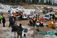 First Responders from St. John Ambulance and fire departments assist paramedics during an exercise outside Thunder Bay, Ontario, Canada