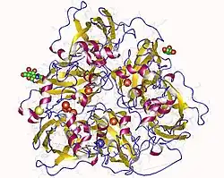 Ceruloplasmin (CP) is an enzyme (EC 1.16.3.1) synthesized in the liver containing 6 atoms of copper in its structure.[9] Ceruloplasmin carries more than 95% of the total copper in healthy human plasma.[10] The rest is accounted for by macroglobulins. Ceruloplasmin exhibits a copper-dependent oxidase activity, which is associated with possible oxidation of Fe2+ (ferrous iron) into Fe3+ (ferric iron), therefore assisting in its transport in the plasma in association with transferrin, which can carry iron only in the ferric state.[11] The molecular weight of human ceruloplasmin is reported to be 151kDa.
