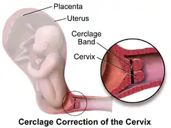 Cervical cerclage, also known as a cervical stitch, is a treatment for cervical weakness, when the cervix starts to shorten and open too early during a pregnancy causing either a late miscarriage or preterm birth. In women with a prior spontaneous preterm birth and who are pregnant with one baby, and have shortening of the cervical length less than 25 mm (0.98 in), a cerclage prevents a preterm birth and reduces death and illness in the baby.[1]