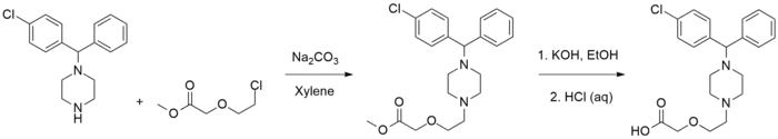 The 1-(4-chlorophenylmethyl)-piperazine is alkylated with methyl (2-chloroethoxy)-acetate in the presence of sodium carbonate and xylene solvent to produce the Sn2 substitution product in 28% yield. Saponification of the acetate ester is done by refluxing with potassium hydroxide in absolute ethanol to afford a 56% yield of the potassium salt intermediate. This is then hydrolyzed with aqueous HCl and extracted to give an 81% yield of the carboxylic acid product.