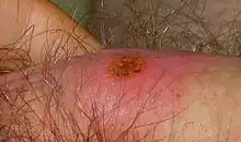 A chancre (/ˈʃæŋkər/ SHANG-kər)[1] is a painless genital ulcer most commonly formed during the primary stage of syphilis.[2] This infectious lesion forms around 21 days after the initial exposure to Treponema pallidum, the gram-negative spirochaete bacterium causing syphilis, but can range from 10 to 90 days.[2] Without treatment it may persist for two to six weeks before healing.[2] Chancres transmit syphilis through direct physical contact. These ulcers usually form on or around the anus, mouth, penis and vulva.