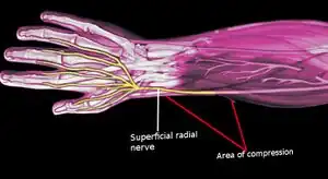 - ↑ 3.0 3.1 3.2 Pećina, Marko; Krmpotić-Nemanić, Jelena; Markiewitz, Andrew D. (2001). "Chapter 26: Syndrome of the Superficial Branch of the Radial Nerve". Tunnel syndromes: peripheral nerve compression syndromes. CRC Press. pp. 152–155.