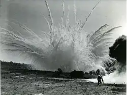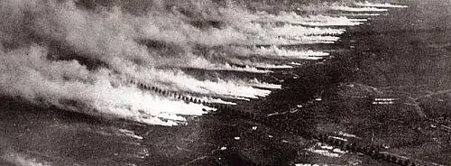 Germany, the first side to employ chemical warfare on the battlefield,[42] simply opened canisters of chlorine upwind of the opposing side and let the prevailing winds do the dissemination. Soon after, the French modified artillery munitions to contain phosgene – a much more effective method that became the principal means of delivery.[43]