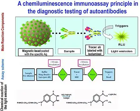 - ↑ Cinquanta L, Fontana DE, Bizzaro N (December 2017). "Chemiluminescent immunoassay technology: what does it change in autoantibody detection?". Auto Immun Highlights. 8 (1): 9. doi:10.1007/s13317-017-0097-2. PMC 5483212. PMID 28647912.